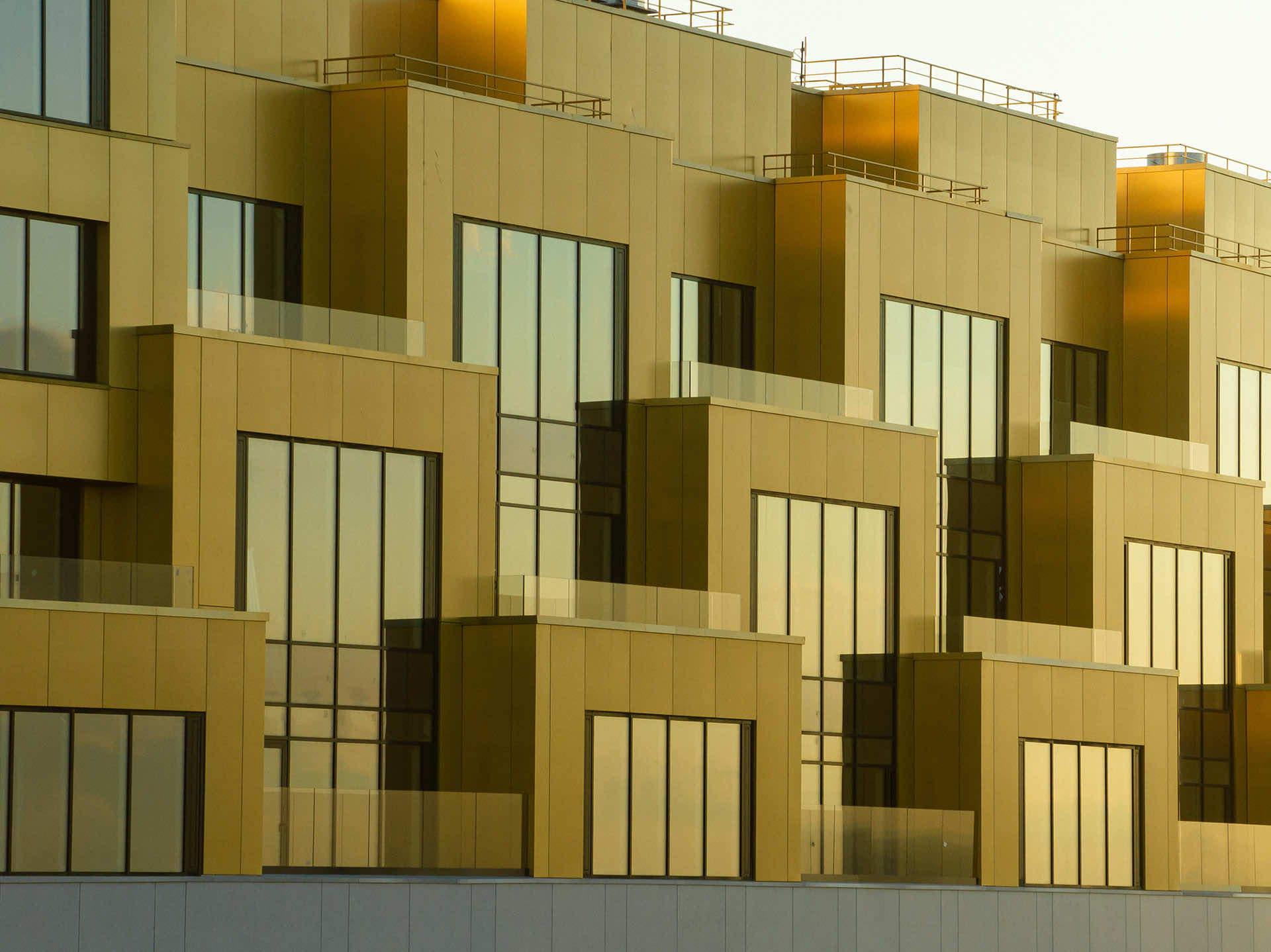 В зоне террас для облицовки фасада использован вентилируемый фасад с шагренью золотого цвета.